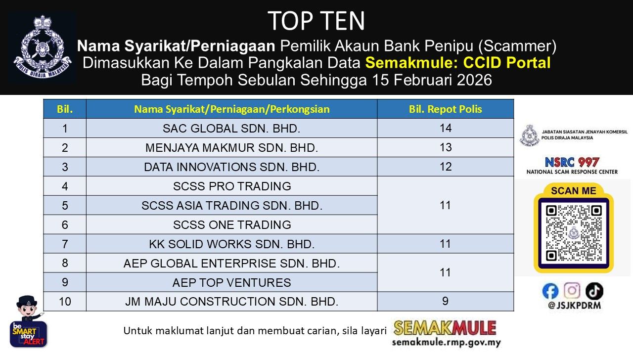 KUALA LUMPUR 26/2/2026 Jabatan Siasatan Jenayah Komersial mengesahkan bahawa setakat ini tiada laporan polis diterima yang secara khusus berkaitan pautan penipuan jemputan berbuka