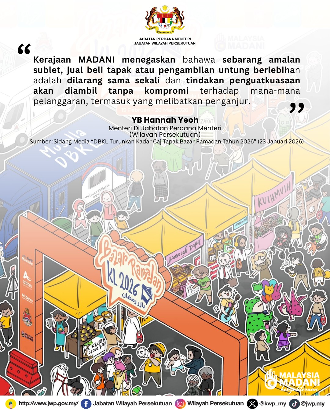 KUALA LUMPUR, 23/2/2026 Kerajaan MADANI menegaskan bahawa tiada sebarang kompromi terhadap amalan sublet, jual beli tapak dan pengambilan keuntungan berlebihan dalam pengurusan Baz