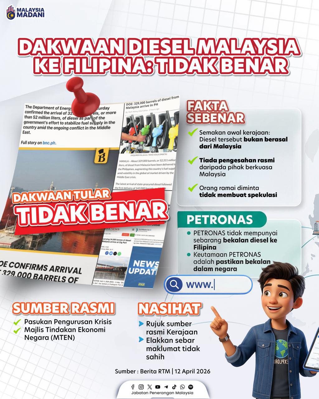 Kuala Lumpur 14/4/2026 Kekeliruan mengenai penghantaran 329,000 tong diesel ke Filipina mencetuskan kebimbangan awam apabila laporan media negara itu menyatakan bahan api berkenaan