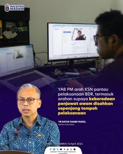 KUALA LUMPUR, 17 April 2026 Perdana Menteri mengarahkan Ketua Setiausaha Negara (KSN) mengambil langkah tegas bagi memastikan pelaksanaan dasar kerajaan berjalan lancar, termasuk mengesahkan kehadiran penjawat awam sepanjang tempoh pelaksanaan yang ditetapkan. Arahan itu dikeluarkan susulan kebimbangan terhadap tahap keberkesanan pelaksanaan di peringkat operasi, yang sering terjejas akibat kelemahan pemantauan