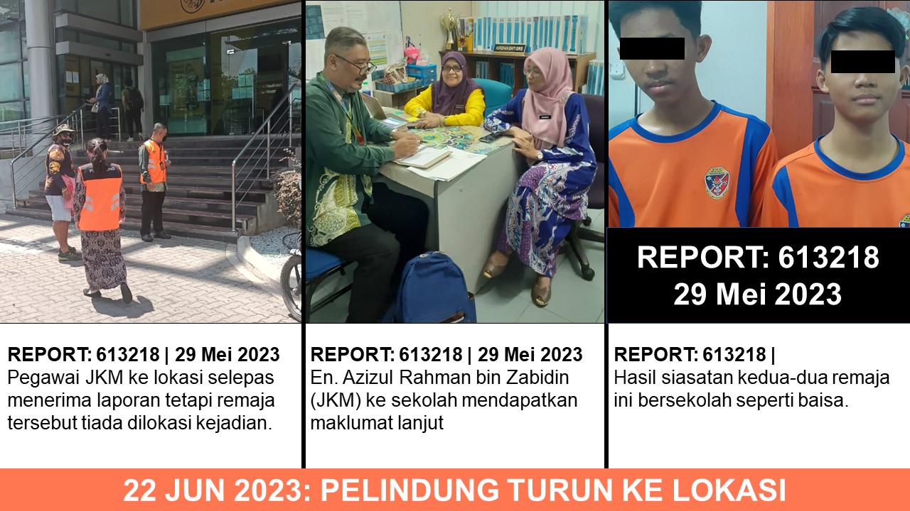 Walaubagaimanapun sewaktu siasatan dibuat remaja tersebut tiada ditapak lokasi. Apabila pemantauan kali kedua dibuat bersama Pelindung dari Unit Kanak-Kanak JKM WPKL juga mendapati remaja tersebut tiada dilokasi (tidak menjalankan aktiviti) sebagaimana dalam aduan. Di samping Pelindung membuat siasatan dan pemerhatian, Pelindung juga telah bertanya kepada Pegawai Keselamatan yang bertugas di Maybank tersebut namun beliau juga memaklumkan tiada melihat kanak-kanak yang menjalankan aktiviti sepertimana dinyatakan.