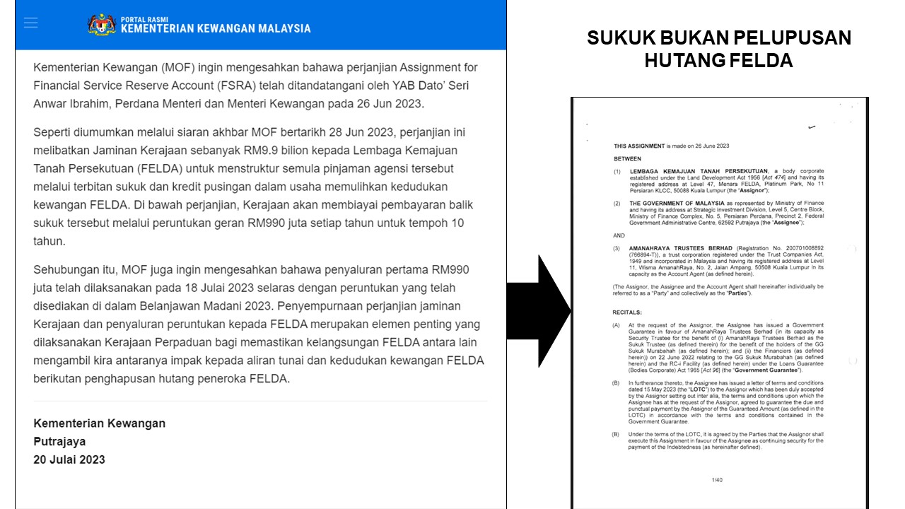 Kenyataan Tan Sri Muhyiddin ini dikuatkan lagi dengan Siaran Media Kementerian Kewangan bertarikh 20 Julai 2023 yang mengesahkan bahawa perjanjian Assignment for Financial Service Reserve Account (FSRA) yang telah ditandatangani oleh Anwar Ibrahim adalah perjanjian melibatkan melibatkan Jaminan Kerajaan sebanyak RM9.9 bilion kepada Lembaga Kemajuan Tanah Persekutuan (FELDA) untuk menstruktur semula pinjaman agensi tersebut melalui terbitan sukuk dan kredit pusingan dalam usaha memulihkan kedudukan kewangan FELDA dan bukan Pelupusan Hutang Peneroka FELDA sebanyak RM8.3bilion.