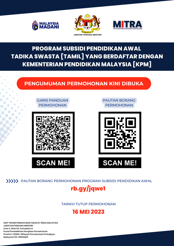 Putrajaya, 27 April 2023 5.00pm. Unit Transformasi Masyarakat India Malaysia (MITRA), Jabatan Perdana Menteri (JPM) mengumumkan permohonan program subsidi pendidikan awal tadika swasta (Tamil) yang berdaftar dengan Kementerian Pendidikan Malaysia (KPM). Pengusaha Tadika yang layak bolehlah mengimbas QR Kod seperti yang tertera bagi membuat permohonan. #PrezCom