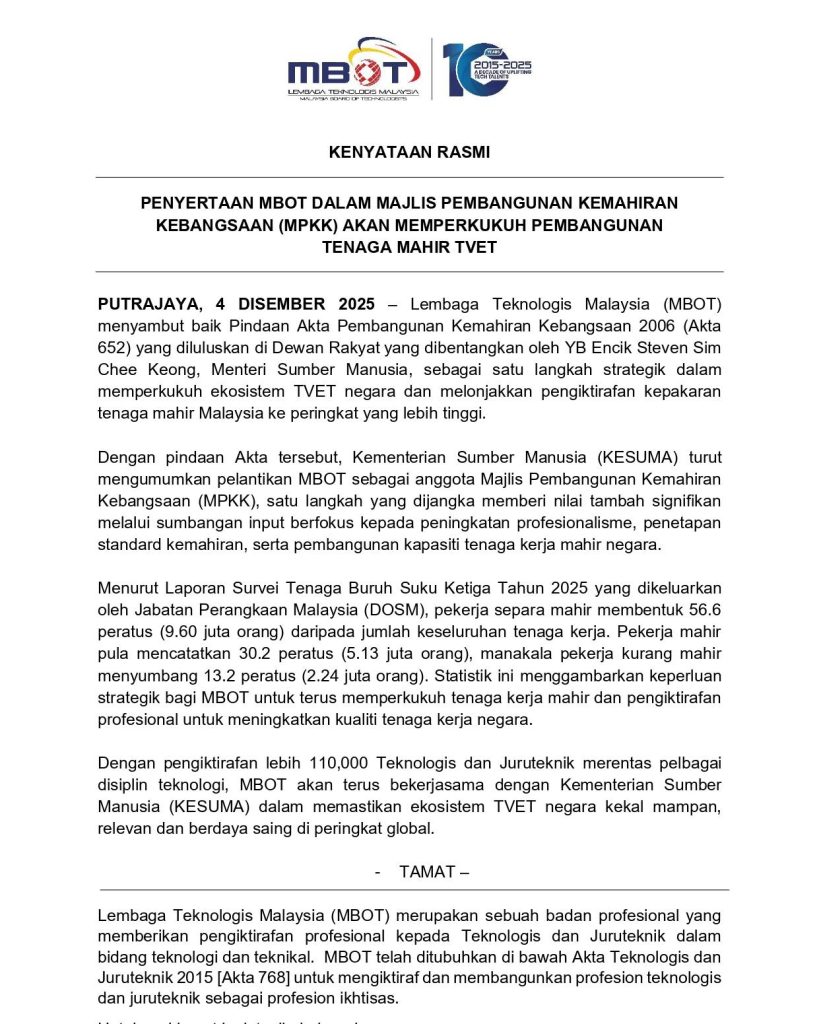 PUTRAJAYA, 6 Disember 2025 PUTRAJAYA, 4 Disember – Malaysia Board of Technologists (MBOT) melakar sejarah baharu apabila bukan sahaja disahkan sebagai anggota Majlis Pembangunan Kemahiran Kebangsaan (MPKK), malah turut menyambut baik pindaan Akta Pembangunan Kemahiran Kebangsaan 2006 (Akta 652) yang diluluskan di Dewan Rakyat. Langkah ini dijangka memberi impak besar kepada ekosistem TVET dan pengiktirafan […]