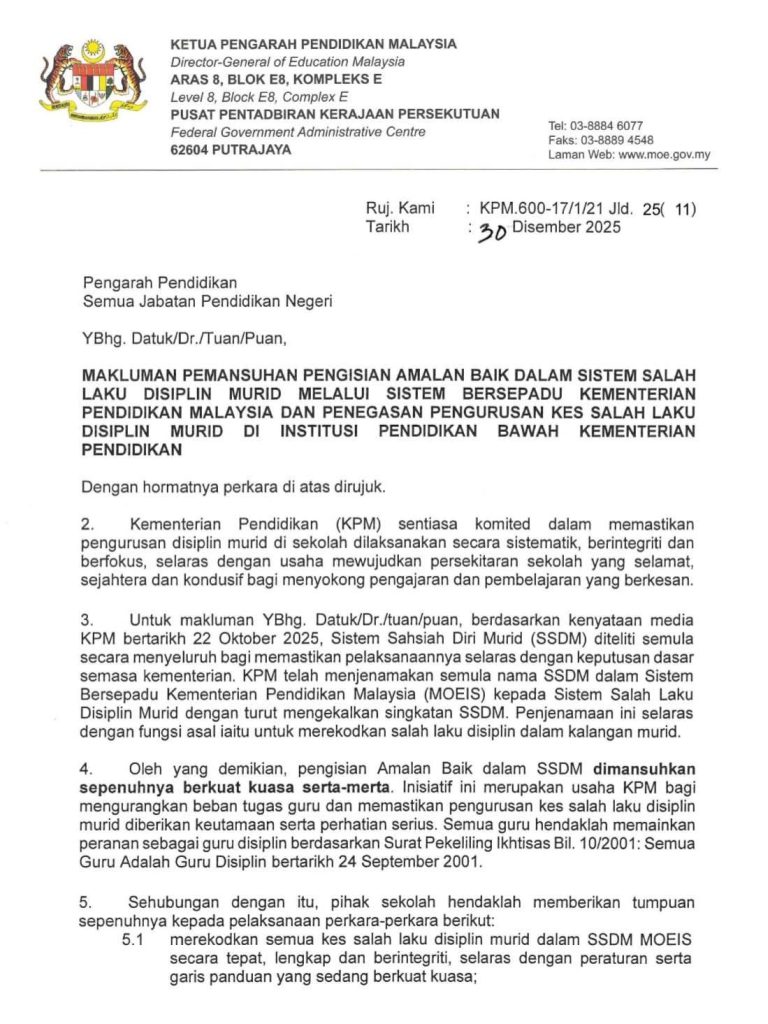 PUTRAJAYA, 3 Januari 2026. Sistem Salah Laku Disiplin Murid (SSDM) kini melalui perubahan besar apabila pengisian rekod “Amalan Baik” dimansuhkan sepenuhnya, berkuat kuasa serta-merta, sekali gus menandakan penyusunan semula mandat sistem itu kepada fungsi asalnya iaitu merekod kes salah laku disiplin murid secara khusus dan berintegriti. Penegasan tersebut dimaklumkan menerusi surat rasmi Kementerian Pendidikan Malaysia […]