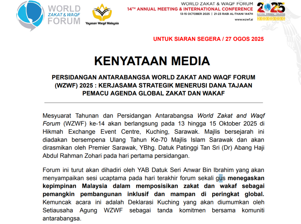 SIARAN MEDIA: PERSIDANGAN ANTARABANGSA WORLD ZAKAT AND WAQF FORUM (WZWF) 2025