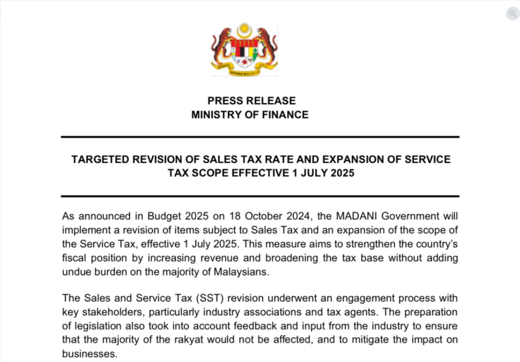 SIARAN MEDIA – PERLUASAN SKOP CUKAI JUALAN (CJ) DAN CUKAI PERKHIDMATAN (CP) MULAI 1 JULAI 2025
