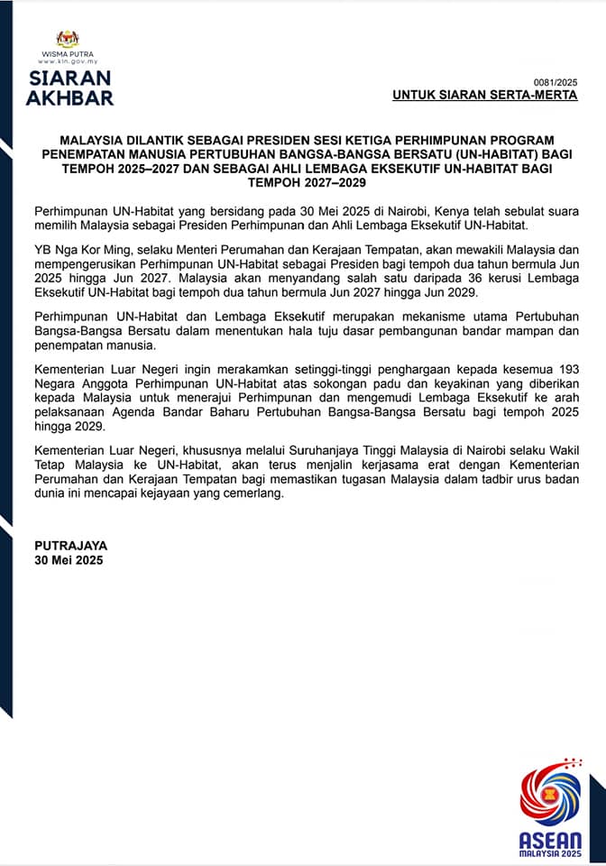KUALA LUMPUR, 2 Jun 2025 – Malaysia mencatat sejarah apabila dilantik sebagai Presiden sesi ketiga Perhimpunan Program Penempatan Manusia Pertubuhan Bangsa-Bangsa Bersatu (UN-Habitat) bagi tempoh 2025 hingga 2027. Selain itu, Malaysia turut dipilih sebagai Ahli Lembaga Eksekutif UN-Habitat bagi sesi 2027 hingga 2029. Pelantikan ini menggambarkan pengiktirafan komuniti antarabangsa terhadap komitmen dan usaha Malaysia dalam […]