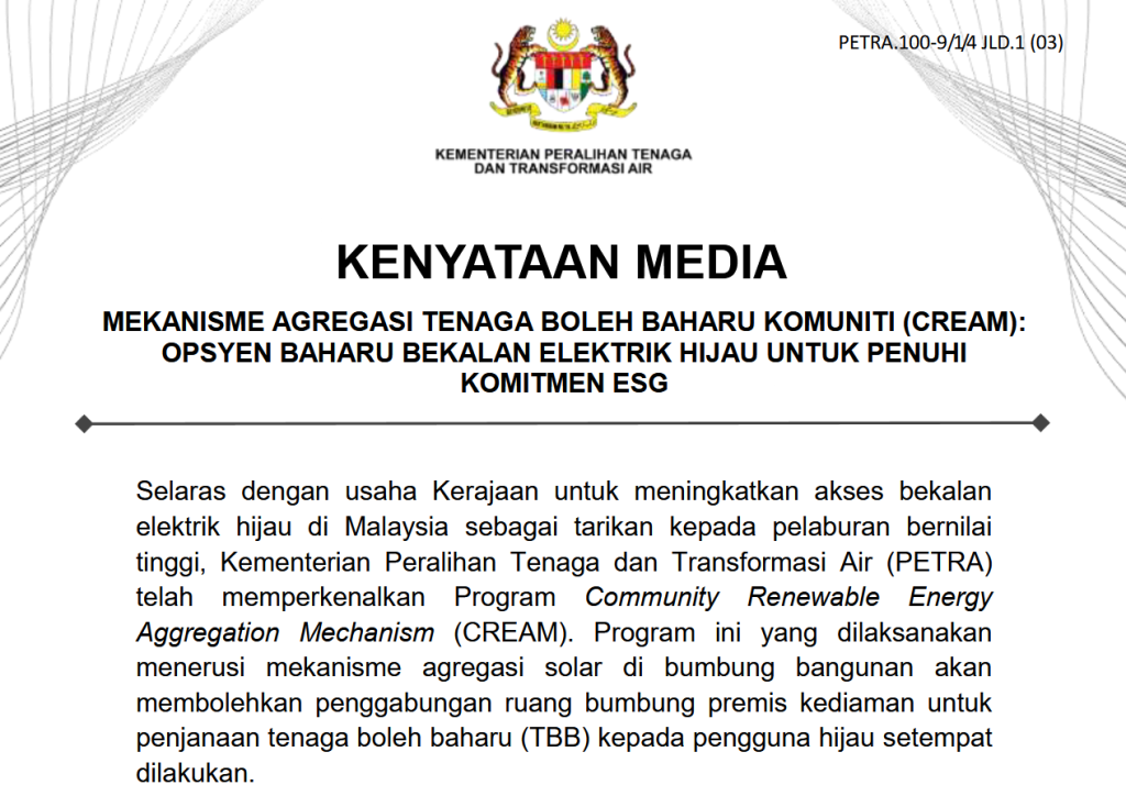 SIARAN MEDIA – MEKANISME AGREGASI TENAGA BOLEH BAHARU KOMUNITI (CREAM): OPSYEN BAHARU BEKALAN ELEKTRIK HIJAU UNTUK PENUHI KOMITMEN ESG