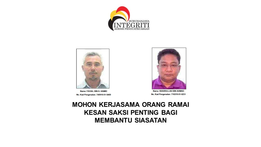 PUTRAJAYA, 11 April 2025. Suruhanjaya Integriti Agensi Penguatkuasaan (EAIC) sedang mengesan dua (2) orang saksi penting bagi membantu siasatan dalam kes yang sedang dijalankan oleh pihak EAIC. Maklumat saksi-saksi yang sedang dikesan adalah seperti berikut: 1. Nama: FAISAL BIN A. HAMID No. Kad Pengenalan: 740916-01-5469 2. Nama: KHAIRULLAH BIN AHMAD No. Kad Pengenalan: 710219-01-6231 Sehubungan […]