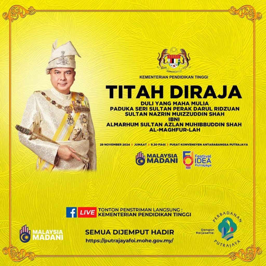 Kuala Lumpur, 26 Nov 2024, 9.00 malam – DULI Yang Maha Mulia Paduka Seri Sultan Perak Darul Ridzuan Sultan Nazrin Muizzuddin Shah ibni Almarhum Sultan Azlan Muhibbuddin Shah Al-Maghfur-Lah berkenan menyampaikan Titah Diraja pada Festival Idea Putrajaya Tahun 2024 seperti ketetapan berikut: 🗓 29 November 2024 (Jumaat) ⏰ 9.30 pagi hingga 11.30 pagi 📍 Dewan […]